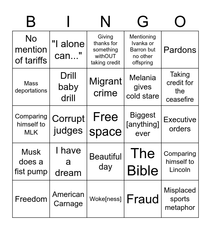 This bingo card has a free space and 24 words: I have a dream, American Carnage, Migrant crime, Freedom, Pardons, No mention of tariffs, Mass deportations, "I alone can...", Biggest [anything] ever, Beautiful day, Melania gives cold stare, Comparing himself to MLK, The Bible, Comparing himself to Lincoln, Drill baby drill, Fraud, Executive orders, Giving thanks for something withOUT taking credit, Taking credit for the ceasefire, Corrupt judges, Misplaced sports metaphor, Musk does a fist pump, Mentioning Ivanka or Barron but no other offspring and Woke[ness].