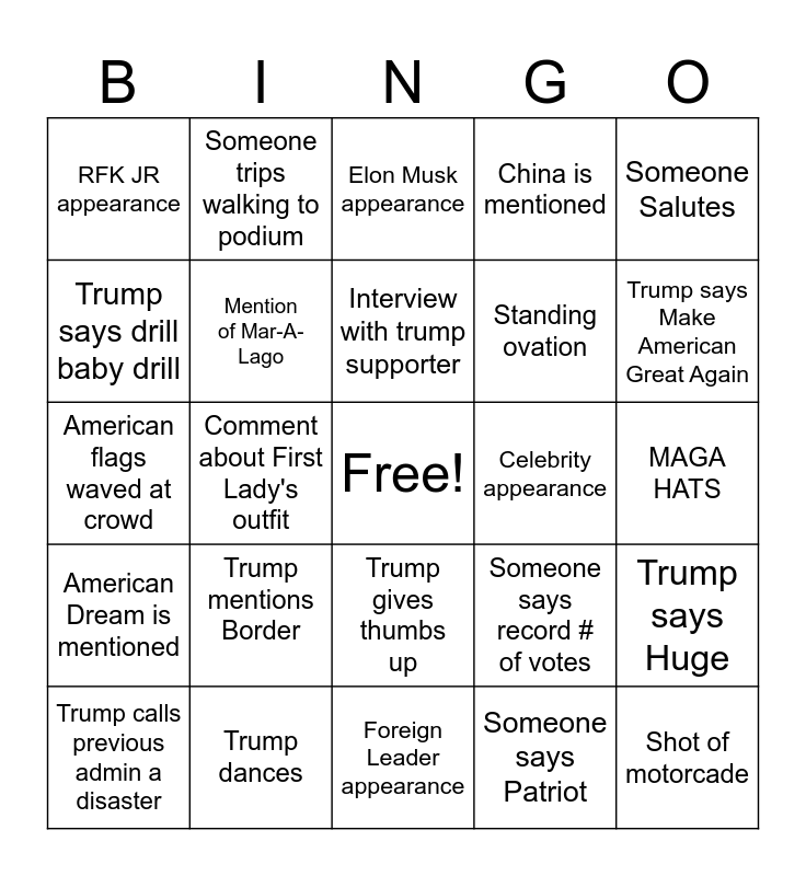 This bingo card has a free space and 29 words: Trump calls previous admin a disaster, Protestors, Comment about First Lady's outfit, Overly Patriotic outfit in crowd, RFK JR appearance, Elon Musk appearance, Mention of Mar-A-Lago, Trump mentions Border, Celebrity appearance, Trump dances, MAGA HATS, Shot of motorcade, Foreign Leader appearance, Someone says Patriot, Trump says Make American Great Again, Secret Service, Trump gives thumbs up, American Dream is mentioned, Someone Salutes, American flags waved at crowd, Someone says record # of votes, Someone is crying, Standing ovation, Trump says drill baby drill, China is mentioned, Someone trips walking to podium, Trump says Huge, Interview with trump supporter and Member of US Military.