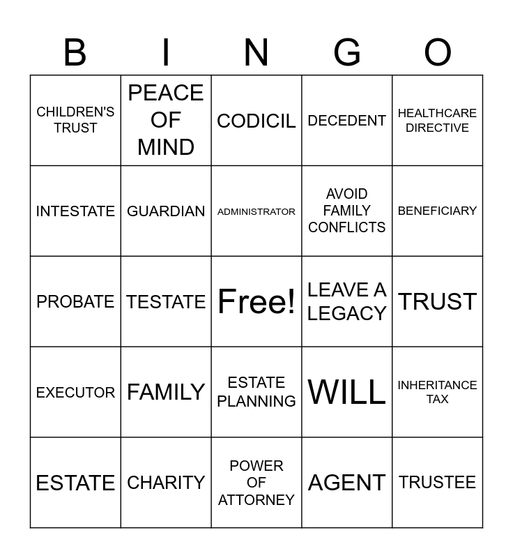 This bingo card has a free space and 24 words: FAMILY, CHARITY, ADMINISTRATOR, ESTATE, HEALTHCARE DIRECTIVE, CHILDREN'S TRUST, INTESTATE, PEACE OF MIND, LEAVE A LEGACY, ESTATE PLANNING, AVOID FAMILY CONFLICTS, PROBATE, WILL, INHERITANCE TAX, GUARDIAN, AGENT, TRUST, CODICIL, BENEFICIARY, TESTATE, TRUSTEE, EXECUTOR, DECEDENT and POWER OF ATTORNEY.