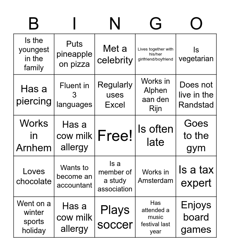 This bingo card has a free space and 30 words: Has a cow milk allergy, Does not drink coffee, Has a cow milk allergy, Has a tattoo, Is the youngest in the family, Met a celebrity, Fluent in 3 languages, Is a member of a study association, Is often late, Plays soccer, Goes to the gym, Enjoys board games, Has attended a music festival last year, Plays padel, Does not live in the Randstad, Has traveled to more than 10 countries, Works in Amsterdam, Loves chocolate, Wants to become an accountant, Is vegetarian, Works in Arnhem, Still lives at home, Puts pineapple on pizza, Works in Alphen aan den Rijn, Has a piercing, Lives together with his/her girlfriend/boyfriend, Is a tax expert, Went on a winter sports holiday, Regularly uses Excel and Prefers working from home.