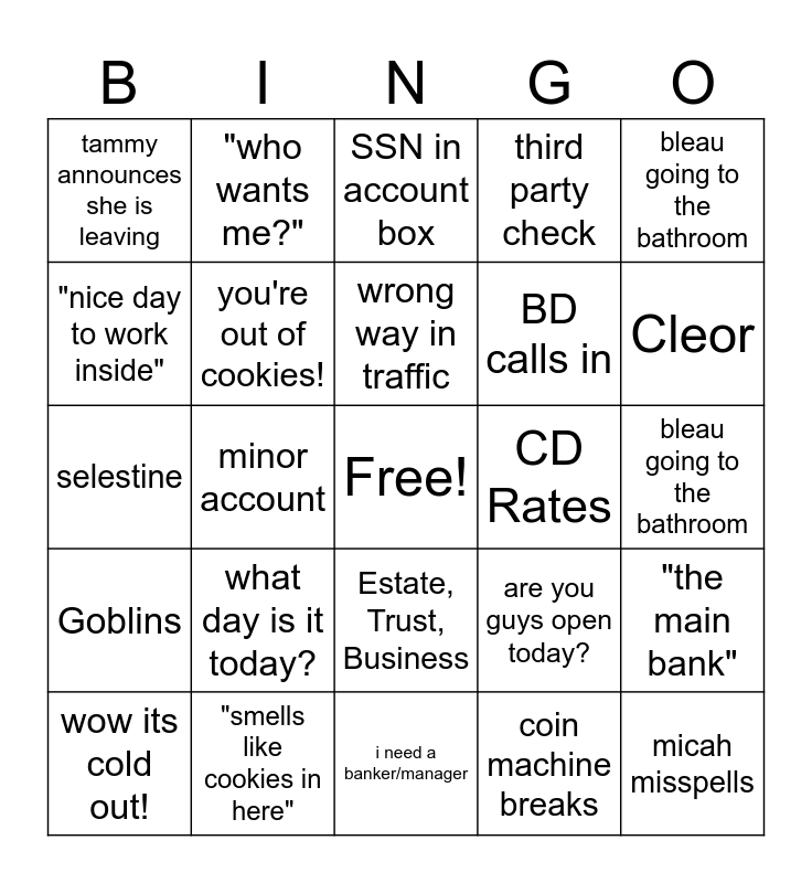 This bingo card has a free space and 24 words: what day is it today?, "smells like cookies in here", wrong way in traffic, wow its cold out!, bleau going to the bathroom, tammy announces she is leaving, "nice day to work inside", "who wants me?", CD Rates, Estate, Trust, Business, BD calls in, selestine, are you guys open today?, "the main bank", you're out of cookies!, coin machine breaks, bleau going to the bathroom, SSN in account box, Cleor, minor account, micah misspells, Goblins, third party check and i need a banker/manager.