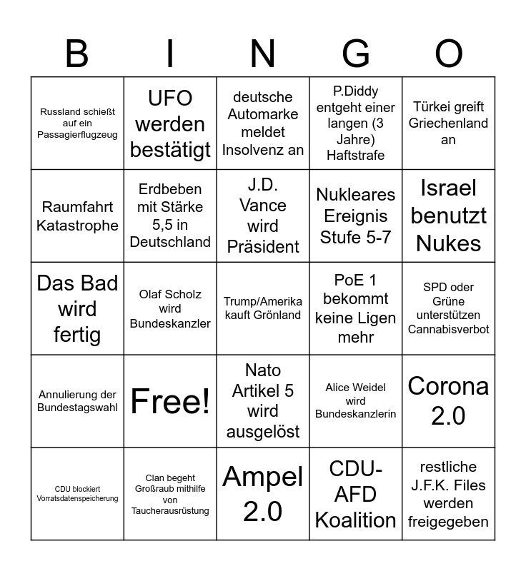 This bingo card has 25 words: Free!, Ampel 2.0, J.D. Vance wird Präsident, CDU blockiert Vorratsdatenspeicherung, Türkei greift Griechenland an, Russland schießt auf ein Passagierflugzeug, Raumfahrt Katastrophe, UFO werden bestätigt, PoE 1 bekommt keine Ligen mehr, Nato Artikel 5 wird ausgelöst, Nukleares Ereignis Stufe 5-7, Das Bad wird fertig, Alice Weidel wird Bundeskanzlerin, Corona 2.0, Erdbeben mit Stärke 5,5 in Deutschland, restliche J.F.K. Files werden freigegeben, SPD oder Grüne unterstützen Cannabisverbot, deutsche Automarke meldet Insolvenz an, Israel benutzt Nukes, Olaf Scholz wird Bundeskanzler, Trump/Amerika kauft Grönland, Clan begeht Großraub mithilfe von Taucherausrüstung, Annulierung der Bundestagswahl, P.Diddy entgeht einer langen (3 Jahre) Haftstrafe and CDU-AFD Koalition.