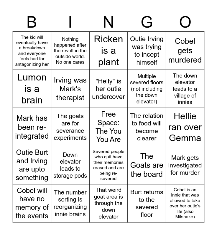 This bingo card has a free space and 24 words: Down elevator leads to storage pods, The number sorting is reorganizing innie brains, "Helly" is her outie undercover, Cobel will have no memory of the events, Cobel gets murdered, The kid will eventually have a breakdown and everyone feels bad for antagonizing her, Lumon is a brain, Nothing happened after the revolt in the outside world. No one cares, The relation to food will become clearer, Severed people who quit have their memories erased and are being re-severed, Multiple severed floors (not including the down elevator), Mark has been re-integrated, The Goats are the board, Mark gets investigated for murder, Irving was Mark's therapist, Burt returns to the severed floor, Hellie ran over Gemma, Ricken is a plant, The down elevator leads to a village of innies, The goats are for severance experiments, Cobel is an innie that was allowed to take over her outie's life (also Milshake), Outie Burt and Irving are upto something, Outie Irving was trying to incept himself and That weird goat area is through the down elevator.
