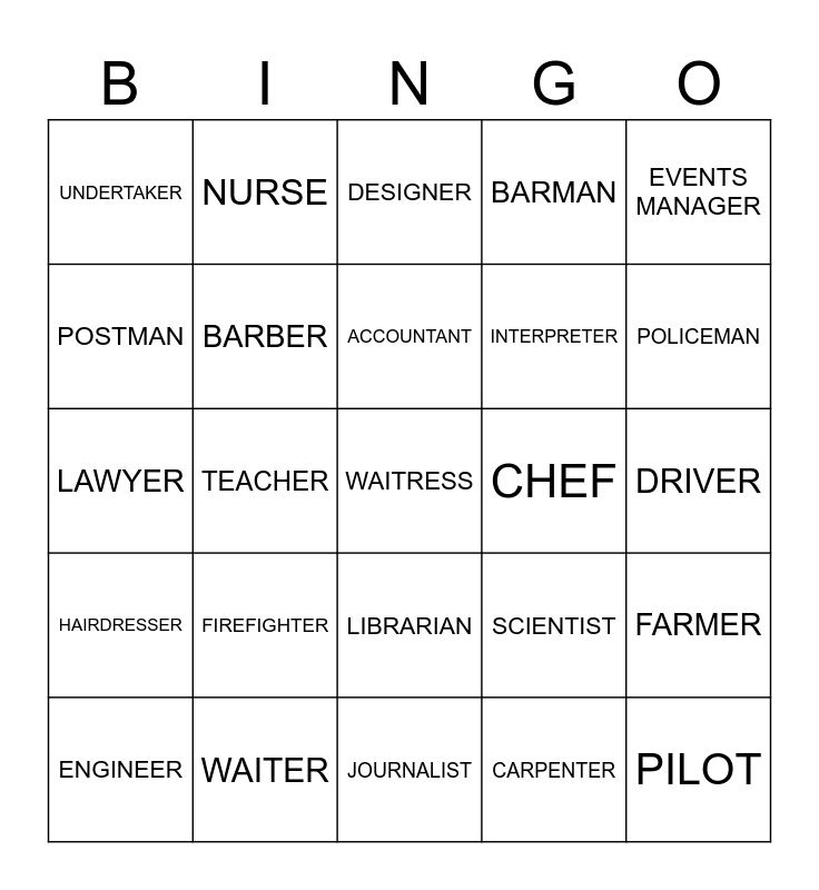 This bingo card has 32 words: CARPENTER, RECEPTIONIST, TEACHER, SALESPERSON, HAIRDRESSER, BARBER, EVENTS MANAGER, FARMER, NURSE, PILOT, ACCOUNTANT, DESIGNER, ARCHITECT, MECHANIC, CHEF, DENTIST, ENGINEER, LAWYER, LIBRARIAN, FIREFIGHTER, SCIENTIST, DOCTOR, DRIVER, WAITER, WAITRESS, BARMAN, INTERPRETER, POSTMAN, UNDERTAKER, JOURNALIST, FLIGHT ATTENDANT and POLICEMAN.