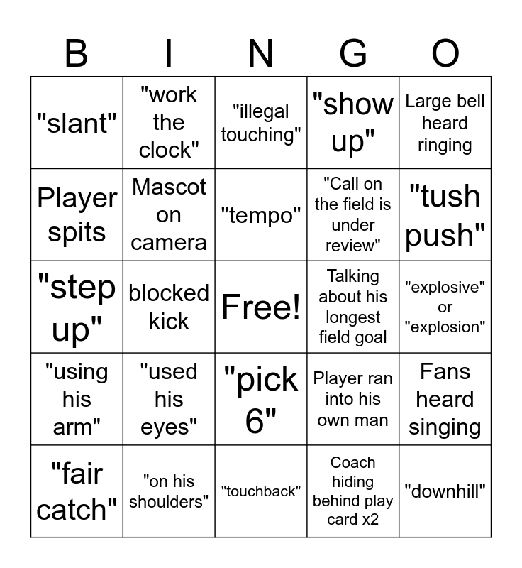 This bingo card has a free space and 44 words: "intentional grounding", "downhill", A cheerleader shaking a pom-pon, "fair catch", "a clinic", Coach hiding behind play card x2, "illegal touching", "and its good!" or "drilled it!", Large bell heard ringing, "on his shoulders", "show up", Talking about his longest field goal, "pick 6", "used his eyes", quarterback sack x2, "touchback", "false start", "step up", Coach challenge, "tush push", "work the clock", Commentators talking to each other on camera during the game, "with his legs", "slant", A cheerleader doing a high kick, "explosive" or "explosion", "physicality", "blitz", Player ran into his own man, "using his arm", "face mask", Fans heard singing, "Hail Mary", "indisputable", blocked kick, "turning the corner", "match up", Player seen going into the medical tent x2, "tempo", Player spits, "Call on the field is under review", onside kick, Mascot on camera and Talking about rushing yards.