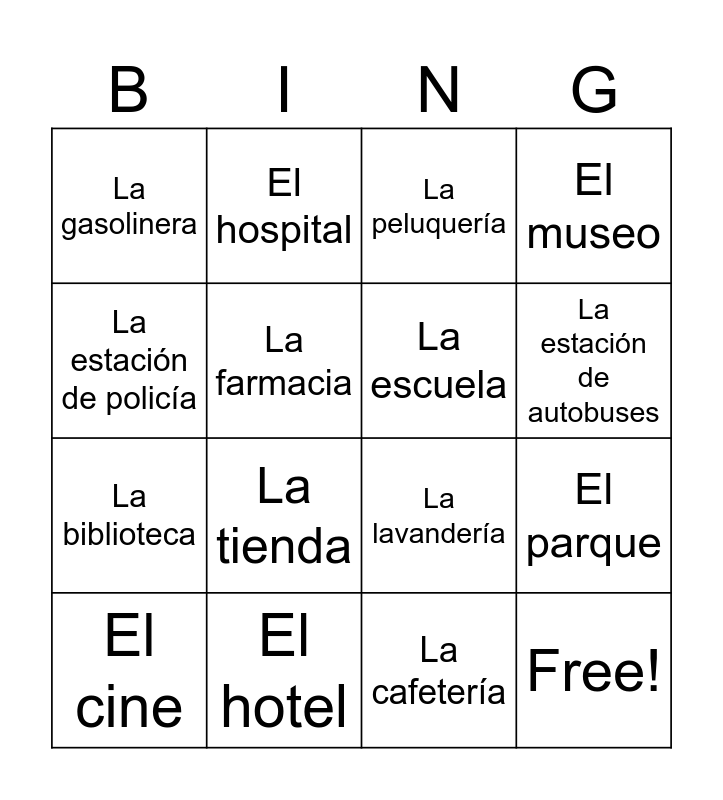 This bingo card has 23 words: Free!, El aeropuerto, La estación de autobuses, La estación de bomberos, La estación de policía, La gasolinera, La farmacia, El hospital, El cine, El centro comercial, La tienda, La biblioteca, El banco, El ayuntamiento, El hotel, El restaurante, La peluquería, La lavandería, La escuela, El parque, El museo, La cafetería and La iglesia.