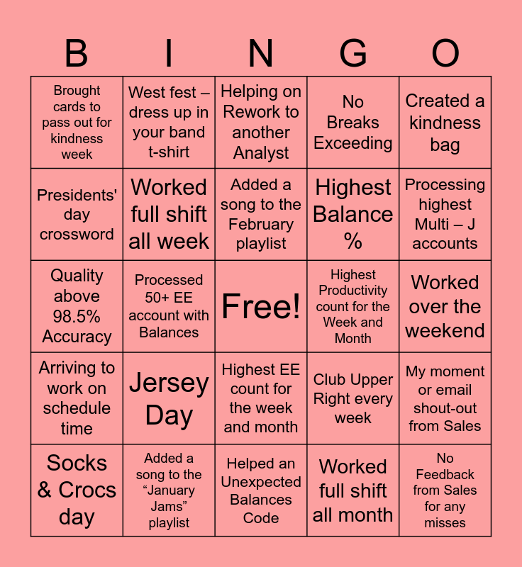 This bingo card has a free space and 24 words: Jersey Day, Added a song to the “January Jams” playlist, Added a song to the February playlist, Socks & Crocs day, Created a kindness bag, Brought cards to pass out for kindness week, Presidents' day crossword, West fest – dress up in your band t-shirt, Highest Productivity count for the Week and Month, Highest EE count for the week and month, Highest Balance %, Quality above 98.5% Accuracy, Club Upper Right every week, My moment or email shout-out from Sales, Worked full shift all week, Worked full shift all month, Worked over the weekend, Helping on Rework to another Analyst, Processing highest Multi – J accounts, Processed 50+ EE account with Balances, No Feedback from Sales for any misses, Arriving to work on schedule time, No Breaks Exceeding and Helped an Unexpected Balances Code.