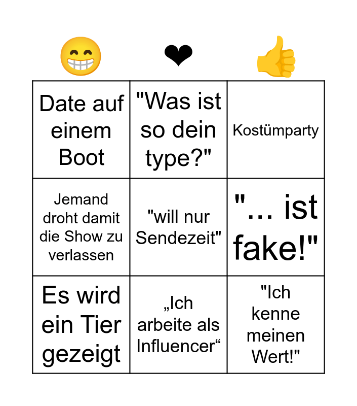 This bingo card has a free space and 8 words: "... ist fake!", Kostümparty, "Was ist so dein type?", Es wird ein Tier gezeigt, Date auf einem Boot, "Ich kenne meinen Wert!", Jemand droht damit die Show zu verlassen and „Ich arbeite als Influencer“.