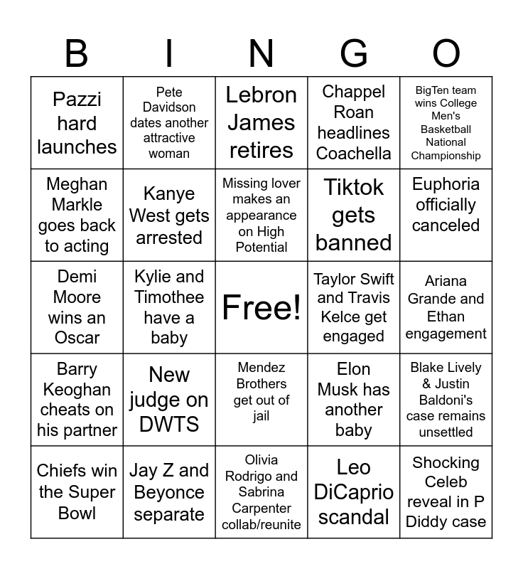 This bingo card has a free space and 24 words: New judge on DWTS, Jay Z and Beyonce separate, Missing lover makes an appearance on High Potential, Chiefs win the Super Bowl, BigTen team wins College Men's Basketball National Championship, Pazzi hard launches, Meghan Markle goes back to acting, Pete Davidson dates another attractive woman, Taylor Swift and Travis Kelce get engaged, Mendez Brothers get out of jail, Tiktok gets banned, Demi Moore wins an Oscar, Elon Musk has another baby, Blake Lively & Justin Baldoni's case remains unsettled, Kanye West gets arrested, Leo DiCaprio scandal, Ariana Grande and Ethan engagement, Lebron James retires, Euphoria officially canceled, Kylie and Timothee have a baby, Shocking Celeb reveal in P Diddy case, Barry Keoghan cheats on his partner, Chappel Roan headlines Coachella and Olivia Rodrigo and Sabrina Carpenter collab/reunite.