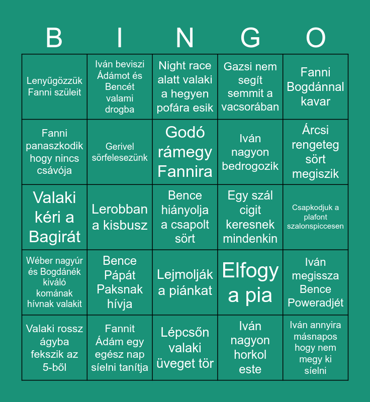 This bingo card has 25 words: Bence Pápát Paksnak hívja, Lépcsőn valaki üveget tör, Godó rámegy Fannira, Valaki rossz ágyba fekszik az 5-ből, Fanni Bogdánnal kavar, Lenyűgözzük Fanni szüleit, Fanni panaszkodik hogy nincs csávója, Iván beviszi Ádámot és Bencét valami drogba, Egy szál cigit keresnek mindenkin, Lejmolják a piánkat, Iván nagyon bedrogozik, Valaki kéri a Bagirát, Elfogy a pia, Iván megissza Bence Poweradjét, Gerivel sörfelesezünk, Iván annyira másnapos hogy nem megy ki síelni, Csapkodjuk a plafont szalonspiccesen, Night race alatt valaki a hegyen pofára esik, Árcsi rengeteg sört megiszik, Lerobban a kisbusz, Bence hiányolja a csapolt sört, Fannit Ádám egy egész nap síelni tanítja, Wéber nagyúr és Bogdánék kiváló komának hívnak valakit, Gazsi nem segít semmit a vacsorában and Iván nagyon horkol este.
