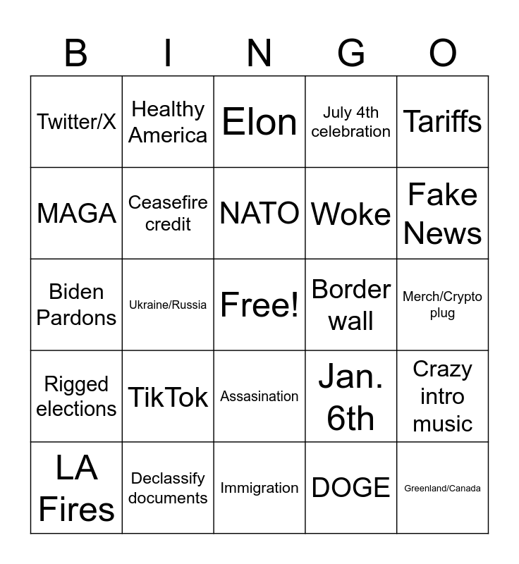 This bingo card has a free space and 24 words: TikTok, Declassify documents, NATO, LA Fires, Tariffs, Twitter/X, MAGA, Healthy America, Border wall, Assasination, Woke, Biden Pardons, Jan. 6th, Crazy intro music, Ceasefire credit, DOGE, Merch/Crypto plug, Elon, Fake News, Ukraine/Russia, Greenland/Canada, Rigged elections, July 4th celebration and Immigration.