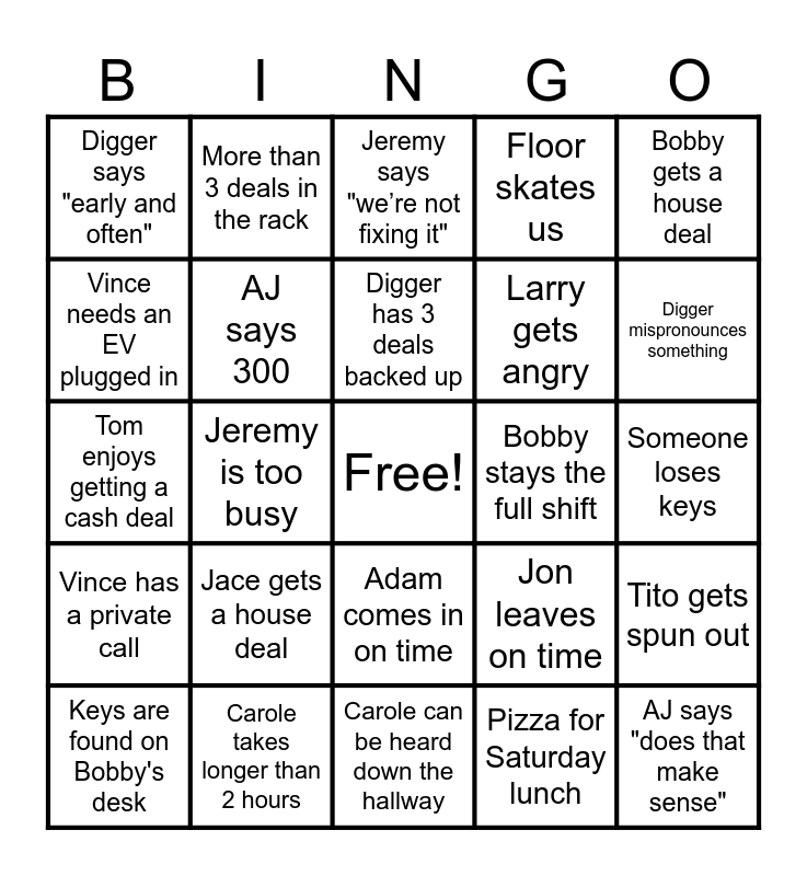 This bingo card has a free space and 24 words: Jace gets a house deal, Carole takes longer than 2 hours, Digger has 3 deals backed up, Keys are found on Bobby's desk, Bobby gets a house deal, Digger says "early and often", Vince needs an EV plugged in, More than 3 deals in the rack, Bobby stays the full shift, Adam comes in on time, Larry gets angry, Tom enjoys getting a cash deal, Jon leaves on time, Tito gets spun out, AJ says 300, Pizza for Saturday lunch, Someone loses keys, Jeremy says "we’re not fixing it", Digger mispronounces something, Jeremy is too busy, AJ says "does that make sense", Vince has a private call, Floor skates us and Carole can be heard down the hallway.