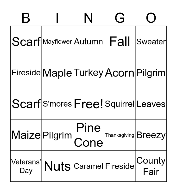 This bingo card has a free space and 77 words: Leaves, Fall, Autumn, Pumpkin, Orange, Scarecrow, Hay, Red, Yellow, Apple, Acorn, Harvest Moon, Turkey, Fireside, Brisk, S'mores, Cider, County Fair, Cranberry, Sweater, Veterans' Day, Scarf, Maple, Mayflower, Fall, Autumn, Pumpkin, Orange, Scarecrow, Hay, Red, Yellow, Apple, Thanksgiving, Pilgrim, Acorn, Harvest Moon, Turkey, Leaves, Fireside, Brisk, S'mores, Cider, County Fair, Cranberry, Sweater, Veterans' Day, Scarf, Maple, Mayflower, Jack O Lantern, Pine Cone, Crisp, October, November, Moonlight, Yam, Pie, banana bread, Football, Pilgrim, Quilt, Cornstalks, Candy Corn, Orchard, Hot Chocolate, Flannel, Squirrel, Thankful, Gathering, Cozy, Breezy, Maize, Nuts, Cobbler, Caramel and Halloween.