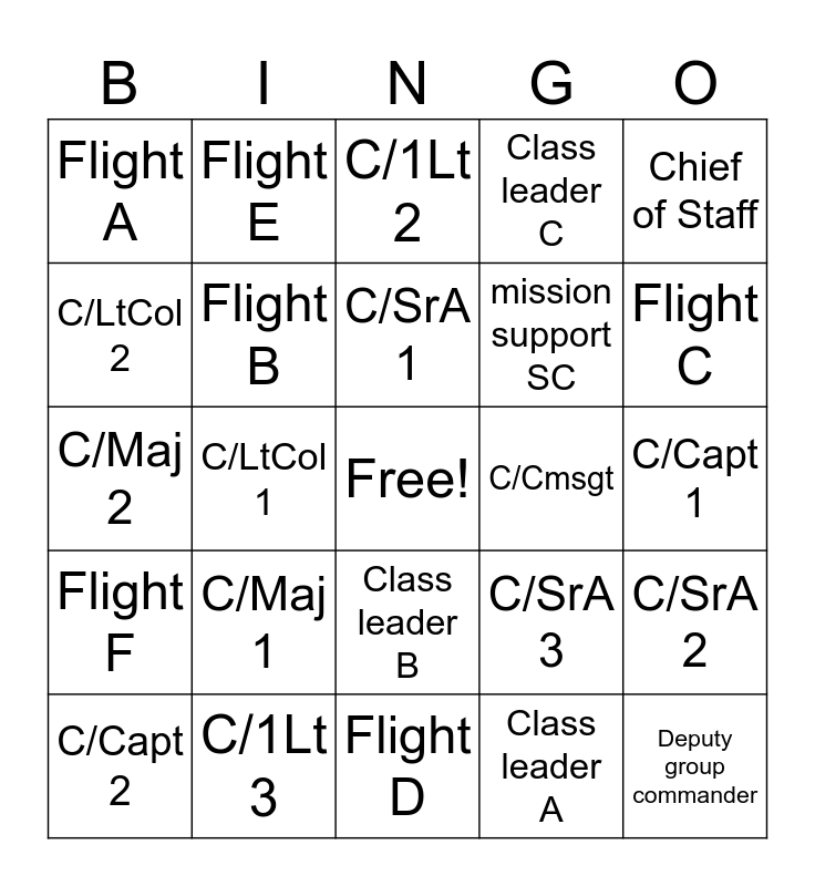 This bingo card has a free space and 30 words: C/1Lt 3, mission support SD, C/LtCol 1, Tactics SC, Flight A, C/1Lt 2, Flight B, Class leader B, C/Cmsgt, Flight D, C/Capt 1, Deputy group commander, Class leader A, group commander, Flight C, Tactics SD, C/SrA 3, Flight F, C/Maj 1, Chief of Staff, C/Maj 2, CIA, Flight E, mission support SC, C/LtCol 2, Class leader C, C/SrA 2, C/Capt 2, C/SrA 1 and C/1Lt 1.
