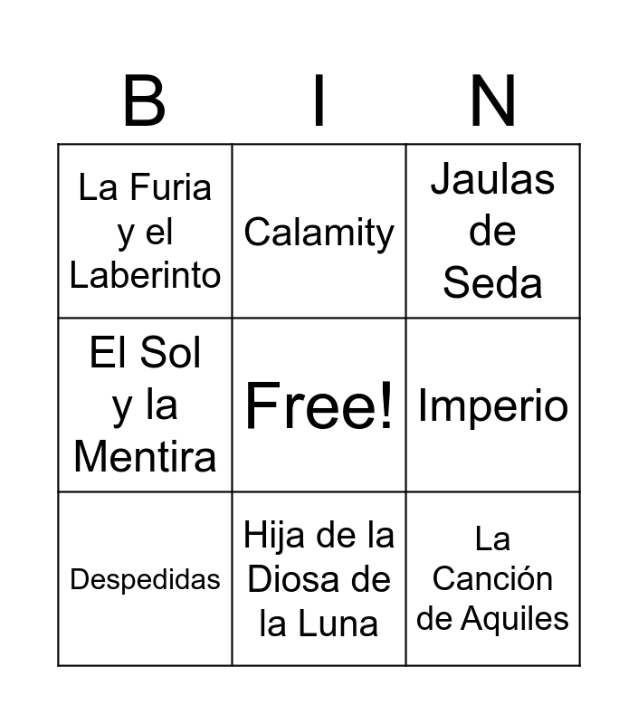 This bingo card has a free space and 8 words: Imperio, Jaulas de Seda, Calamity, Despedidas, La Furia y el Laberinto, La Canción de Aquiles, El Sol y la Mentira and Hija de la Diosa de la Luna.