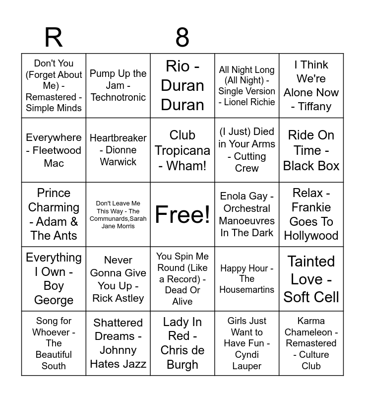 This bingo card has a free space and 42 words: I Want To Break Free - Queen, Club Tropicana - Wham!, I Wanna Dance with Somebody - Single Version - Whitney Houston, Never Gonna Give You Up - Rick Astley, Girls Just Want to Have Fun - Cyndi Lauper, Tainted Love - Soft Cell, Karma Chameleon - Remastered - Culture Club, Don't You Want Me - Remastered - The Human League, Rio - Duran Duran, You Spin Me Round (Like a Record) - Dead Or Alive, Relax - Frankie Goes To Hollywood, Ride On Time - Black Box, Don't Leave Me This Way - The Communards,Sarah Jane Morris, I Think We're Alone Now - Tiffany, Tell It to My Heart - Taylor Dayne, Happy Hour - The Housemartins, Heaven Is a Place on Earth - Belinda Carlisle, Prince Charming - Adam & The Ants, Echo Beach - Martha and the Muffins, Pump Up the Jam - Technotronic, Everywhere - Fleetwood Mac, Every Breath You Take - The Police, Africa - Single Version - TOTO, Don't You (Forget About Me) - Remastered - Simple Minds, I'm Still Standing - Elton John, Start Me Up - Remastered - The Rolling Stones, (I Just) Died in Your Arms - Cutting Crew, Golden Brown - The Stranglers, It Must Be Love - Madness, I Got You Babe (feat. Chrissie Hynde) - UB40,Chrissie Hynde, Love of the Common People - Paul Young, Everything I Own - Boy George, Heartbreaker - Dionne Warwick, Lady In Red - Chris de Burgh, Toy Soldiers - Martika, Song for Whoever - The Beautiful South, Shattered Dreams - Johnny Hates Jazz, Enola Gay - Orchestral Manoeuvres In The Dark, Together In Electric Dreams - Phil Oakey,Giorgio Moroder, Pop Muzik - M, All Night Long (All Night) - Single Version - Lionel Richie and Never Too Much - Luther Vandross.