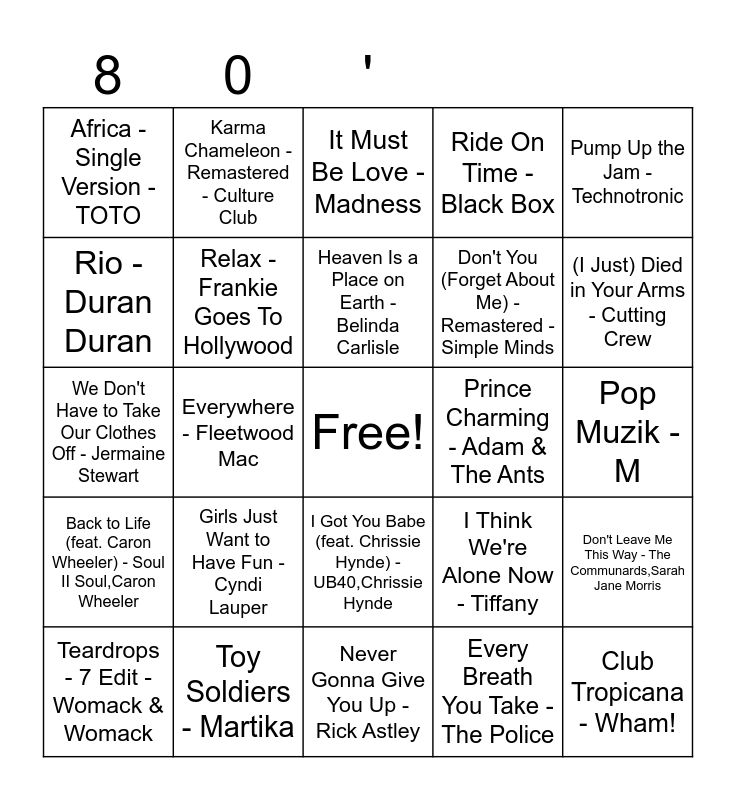 This bingo card has a free space and 50 words: I Want To Break Free - Queen, Club Tropicana - Wham!, I Wanna Dance with Somebody - Single Version - Whitney Houston, Never Gonna Give You Up - Rick Astley, Girls Just Want to Have Fun - Cyndi Lauper, Tainted Love - Soft Cell, Karma Chameleon - Remastered - Culture Club, Don't You Want Me - Remastered - The Human League, Rio - Duran Duran, You Spin Me Round (Like a Record) - Dead Or Alive, Relax - Frankie Goes To Hollywood, Ride On Time - Black Box, Don't Leave Me This Way - The Communards,Sarah Jane Morris, I Think We're Alone Now - Tiffany, Tell It to My Heart - Taylor Dayne, Happy Hour - The Housemartins, Heaven Is a Place on Earth - Belinda Carlisle, Prince Charming - Adam & The Ants, Echo Beach - Martha and the Muffins, Pump Up the Jam - Technotronic, Everywhere - Fleetwood Mac, Every Breath You Take - The Police, Africa - Single Version - TOTO, Don't You (Forget About Me) - Remastered - Simple Minds, I'm Still Standing - Elton John, Start Me Up - Remastered - The Rolling Stones, (I Just) Died in Your Arms - Cutting Crew, Golden Brown - The Stranglers, It Must Be Love - Madness, I Got You Babe (feat. Chrissie Hynde) - UB40,Chrissie Hynde, Love of the Common People - Paul Young, Everything I Own - Boy George, Heartbreaker - Dionne Warwick, Lady In Red - Chris de Burgh, Toy Soldiers - Martika, Song for Whoever - The Beautiful South, Shattered Dreams - Johnny Hates Jazz, Enola Gay - Orchestral Manoeuvres In The Dark, Together In Electric Dreams - Phil Oakey,Giorgio Moroder, Pop Muzik - M, All Night Long (All Night) - Single Version - Lionel Richie, Never Too Much - Luther Vandross, Footloose - From the Paramount Film Footloose - Kenny Loggins, I Feel for You - Chaka Khan, Teardrops - 7 Edit - Womack & Womack, We Don't Have to Take Our Clothes Off - Jermaine Stewart, It's Raining Men - Single Version - The Weather Girls, Celebration - Single Version - Kool & The Gang, Back to Life (feat. Caron Wheeler) - Soul II Soul,Caron Wheeler and Red Red Wine (Edit) [Remastered] - UB40.