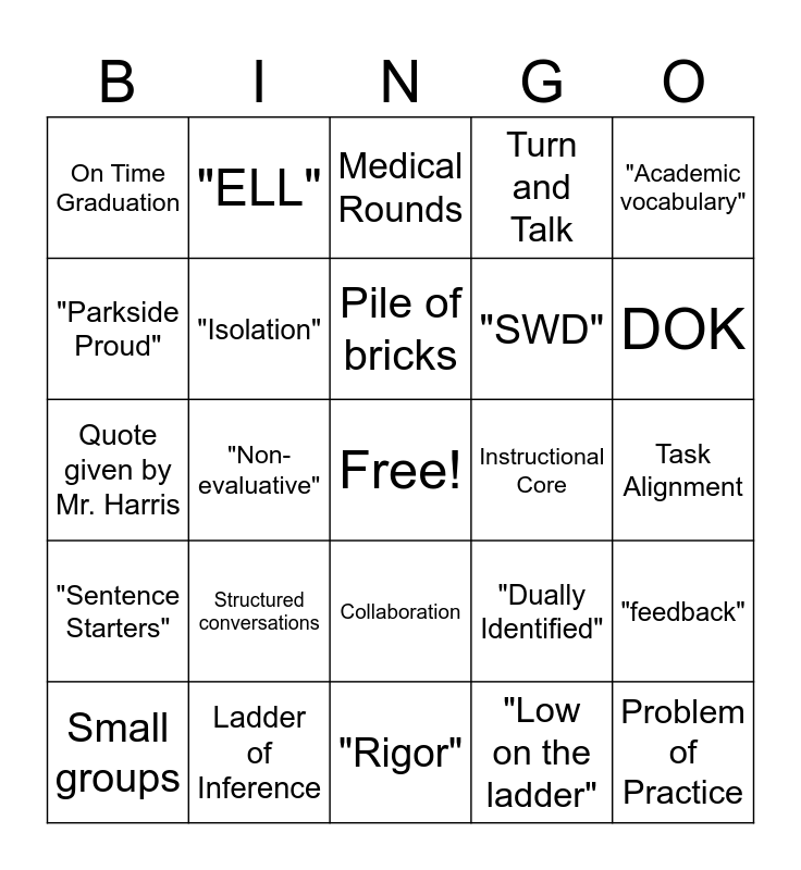 This bingo card has a free space and 30 words: Ladder of Inference, "No judgement", "Non-evaluative", WIG, On Time Graduation, Medical Rounds, "Isolation", Collaboration, Instructional Core, "Rigor", Task Alignment, Problem of Practice, "Low on the ladder", See and hear, DOK, 7 Steps, "Dually Identified", "Sentence Starters", Structured conversations, "Academic vocabulary", Quote given by Mr. Harris, CIP, "ELL", "SWD", "Parkside Proud", Turn and Talk, "feedback", Small groups, Pile of bricks and Mrs. Porter-Lucas says "Grounded in our work".