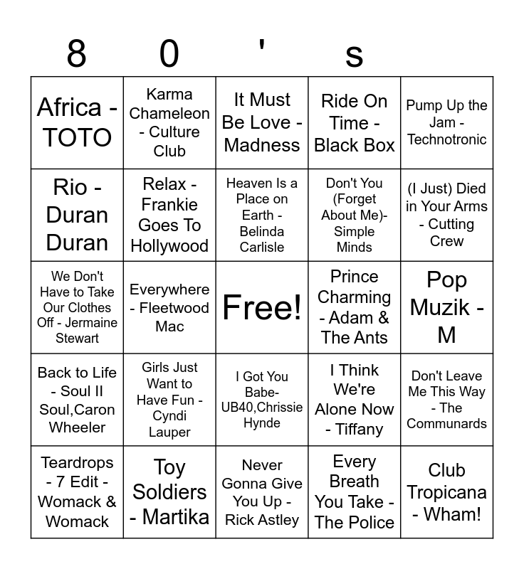 This bingo card has a free space and 50 words: I Want To Break Free - Queen, Club Tropicana - Wham!, I Wanna Dance with Somebody - Whitney Houston, Never Gonna Give You Up - Rick Astley, Girls Just Want to Have Fun - Cyndi Lauper, Tainted Love - Soft Cell, Karma Chameleon - Culture Club, Don't You Want Me - The Human League, Rio - Duran Duran, You Spin Me Round - Dead Or Alive, Relax - Frankie Goes To Hollywood, Ride On Time - Black Box, Don't Leave Me This Way - The Communards, I Think We're Alone Now - Tiffany, Tell It to My Heart - Taylor Dayne, Happy Hour - The Housemartins, Heaven Is a Place on Earth - Belinda Carlisle, Prince Charming - Adam & The Ants, Echo Beach - Martha and the Muffins, Pump Up the Jam - Technotronic, Everywhere - Fleetwood Mac, Every Breath You Take - The Police, Africa - TOTO, Don't You (Forget About Me)- Simple Minds, I'm Still Standing - Elton John, Start Me Up - The Rolling Stones, (I Just) Died in Your Arms - Cutting Crew, Golden Brown - The Stranglers, It Must Be Love - Madness, I Got You Babe- UB40,Chrissie Hynde, Love of the Common People - Paul Young, Everything I Own - Boy George, Heartbreaker - Dionne Warwick, Lady In Red - Chris de Burgh, Toy Soldiers - Martika, Song for Whoever - The Beautiful South, Shattered Dreams - Johnny Hates Jazz, Enola Gay - Orchestral Manoeuvres In The Dark, Together In Electric Dreams - Phil Oakey,Giorgio Moroder, Pop Muzik - M, All Night Long (All Night) -Lionel Richie, Never Too Much - Luther Vandross, Footloose - - Kenny Loggins, I Feel for You - Chaka Khan, Teardrops - 7 Edit - Womack & Womack, We Don't Have to Take Our Clothes Off - Jermaine Stewart, It's Raining Men - The Weather Girls, Celebration - Single Version - Kool & The Gang, Back to Life - Soul II Soul,Caron Wheeler and Red Red Wine - UB40.