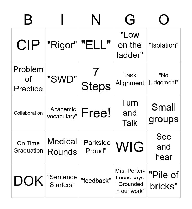 This bingo card has a free space and 30 words: "Sentence Starters", Structured conversations, "Academic vocabulary", Quote given by Mr. Harris, CIP, "ELL", "SWD", "Parkside Proud", Turn and Talk, "feedback", Small groups, "Pile of bricks", Mrs. Porter-Lucas says "Grounded in our work", Ladder of Inference, "No judgement", "Non-evaluative", WIG, On Time Graduation, Medical Rounds, "Isolation", Collaboration, Instructional Core, "Rigor", Task Alignment, Problem of Practice, "Low on the ladder", See and hear, DOK, 7 Steps and "Dually Identified".