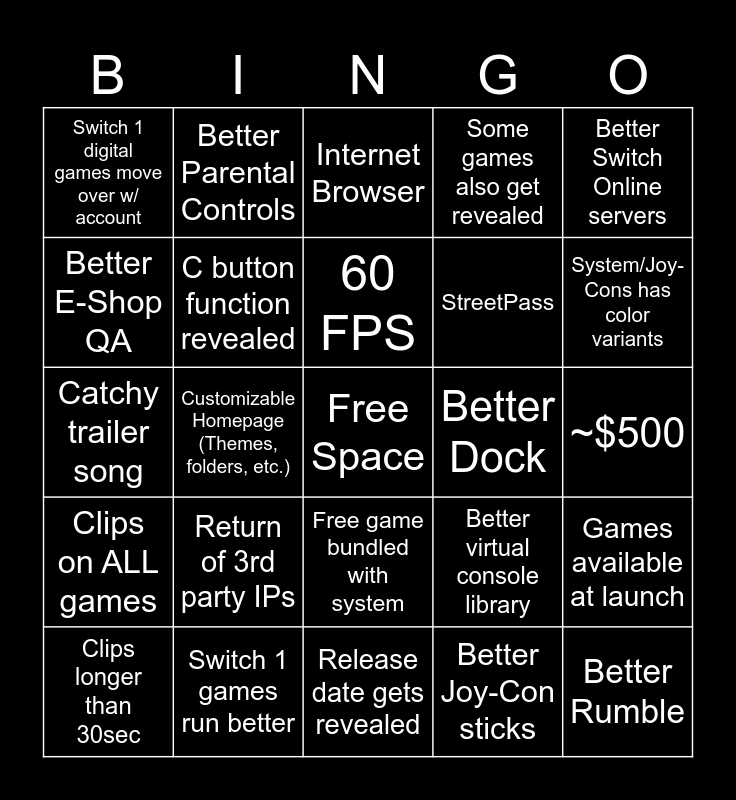 This bingo card has a free space and 24 words: Return of 3rd party IPs, Switch 1 games run better, 60 FPS, Clips longer than 30sec, Better Switch Online servers, Switch 1 digital games move over w/ account, Better E-Shop QA, Better Parental Controls, Better Dock, Free game bundled with system, StreetPass, Catchy trailer song, Better virtual console library, Games available at launch, C button function revealed, Better Joy-Con sticks, ~$500, Internet Browser, System/Joy-Cons has color variants, Customizable Homepage (Themes, folders, etc.), Better Rumble, Clips on ALL games, Some games also get revealed and Release date gets revealed.