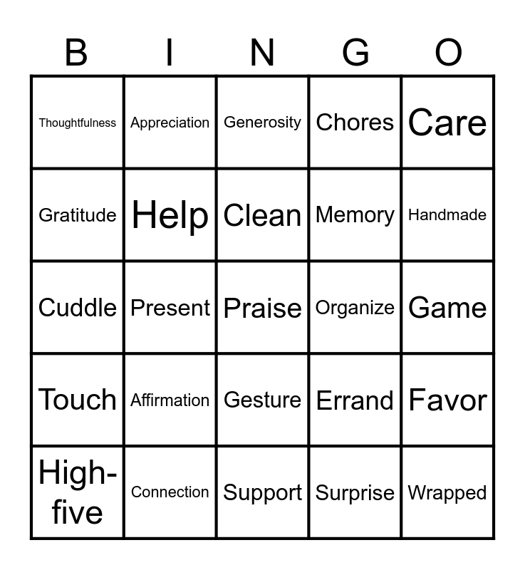 This bingo card has 50 words: Compliment, Praise, Encouragement, Support, Affirmation, Kindness, Appreciation, "I love you", Gratitude, Positivity, Help, Chores, Favor, Errand, Effort, Cook, Clean, Organize, Repair, Care, Present, Surprise, Thoughtfulness, Memory, Token, Wrapped, Handmade, Keepsake, Generosity, Gesture, Conversation, Listening, Focus, Togetherness, Connection, Movie, Walk, Trip, Meal, Game, Hug, Handshake, Kiss, Pat, High-five, Cuddle, Hold, Comfort, Touch and Closeness.