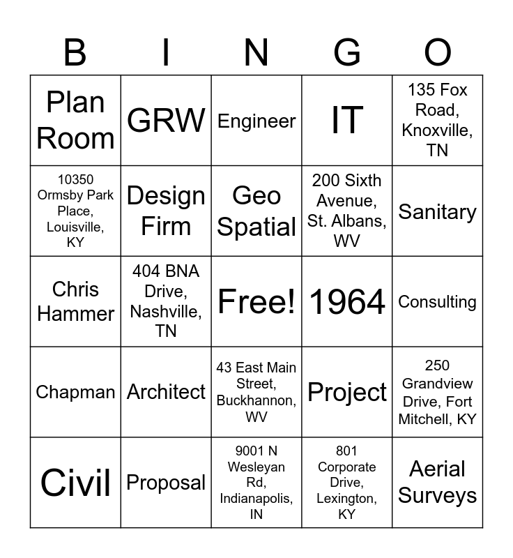 This bingo card has a free space and 24 words: Architect, Proposal, Geo Spatial, Civil, 135 Fox Road, Knoxville, TN, Plan Room, 10350 Ormsby Park Place, Louisville, KY, GRW, 1964, 43 East Main Street, Buckhannon, WV, 200 Sixth Avenue, St. Albans, WV, Chris Hammer, Project, 250 Grandview Drive, Fort Mitchell, KY, Design Firm, 801 Corporate Drive, Lexington, KY, Consulting, Engineer, Sanitary, 404 BNA Drive, Nashville, TN, Aerial Surveys, Chapman, IT and 9001 N Wesleyan Rd, Indianapolis, IN.