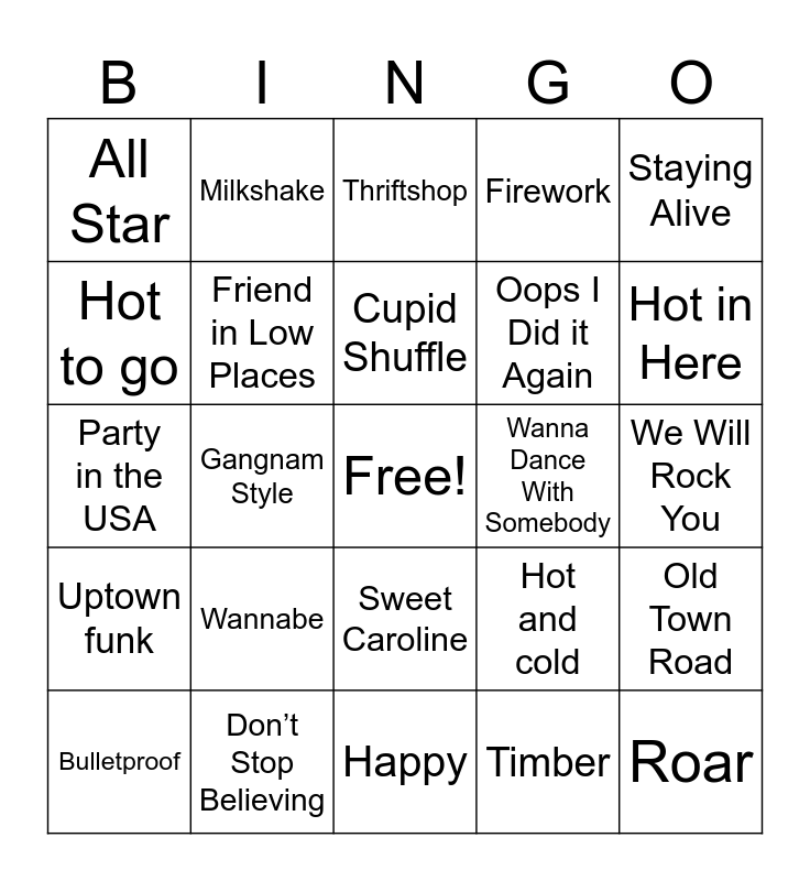 This bingo card has a free space and 41 words: Angel, Party in the USA, Girls Just Wanna Have Fun, Friend in Low Places, Don’t Stop Believing, Sweet Caroline, Cupid Shuffle, Wobble, Staying Alive, Uptown funk, Gangnam Style, Firework, Roar, We Will Rock You, Wanna Dance With Somebody, Wannabe, Cotton Eye Joe, All Star, Baby Shark, Thriftshop, Old Town Road, Call Me Maybe, Happy, Oops I Did it Again, September, Pumped Up Kicks, Timber, Unwritten, Hot in Here, Anthem, Taylor swift, Milkshake, Bulletproof, California girls, Hot and cold, Hot to go, Had the time of t life, Footloose, Macarena, Every body wants to rule the world and Don't you forget about me.