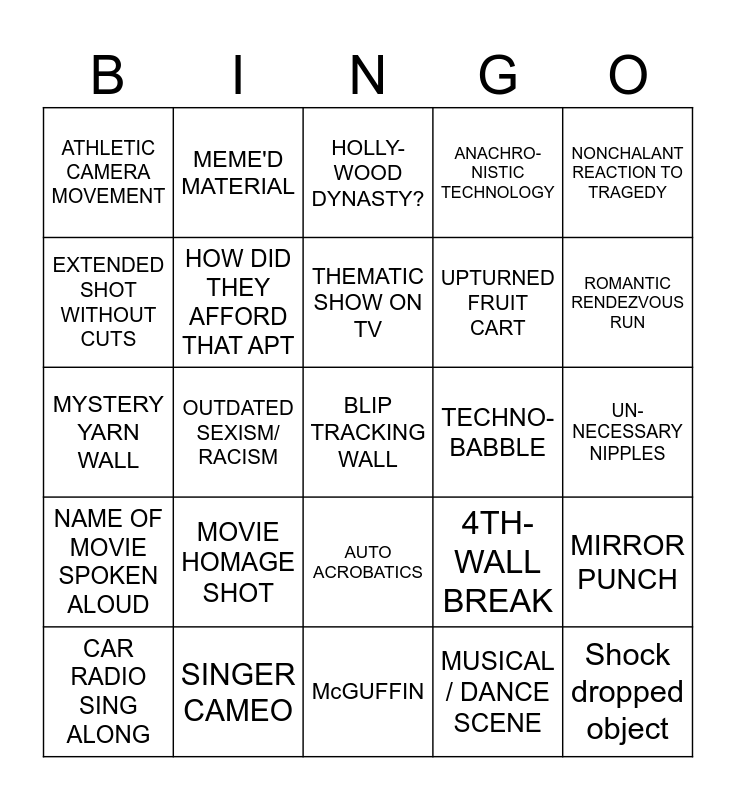 This bingo card has 26 words: AUTO ACROBATICS, MUSICAL / DANCE SCENE, THEMATIC SHOW ON TV, SINGER CAMEO, NONCHALANT REACTION TO TRAGEDY, ATHLETIC CAMERA MOVEMENT, EXTENDED SHOT WITHOUT CUTS, MEME'D MATERIAL, UN- NECESSARY NIPPLES, 4TH-WALL BREAK, UPTURNED FRUIT CART, MYSTERY YARN WALL, MIRROR PUNCH, CAR RADIO SING ALONG, OUTDATED SEXISM/ RACISM, ANACHRO-NISTIC THREAT, ANACHRO-NISTIC TECHNOLOGY, NAME OF MOVIE SPOKEN ALOUD, HOLLY-WOOD DYNASTY?, BLIP TRACKING WALL, ROMANTIC RENDEZVOUS RUN, McGUFFIN, TECHNO-BABBLE, MOVIE HOMAGE SHOT, HOW DID THEY AFFORD THAT APT and Shock dropped object.