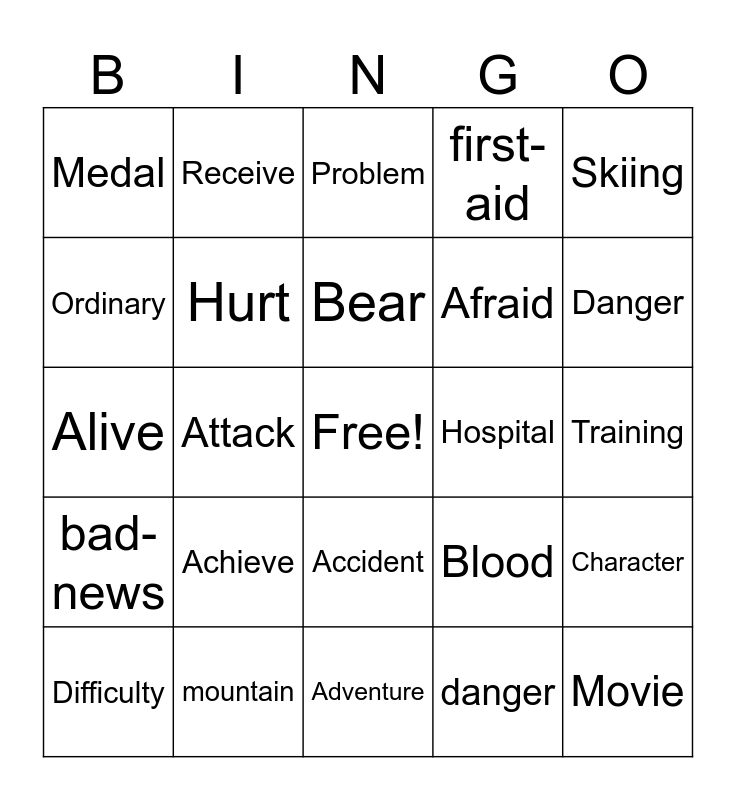 This bingo card has a free space and 25 words: Achieve, Adventure, Bear, Difficulty, Skiing, Medal, Ordinary, Receive, Hospital, Accident, Afraid, Alive, Blood, Character, Hurt, Impossible, Training, Problem, Danger, Attack, Movie, mountain, bad-news, first-aid and danger.