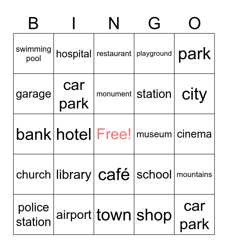 This bingo card has a free space and 24 words: library, airport, monument, police station, park, swimming pool, garage, hospital, museum, café, station, bank, school, mountains, car park, shop, cinema, restaurant, city, hotel, car park, church, playground and town.