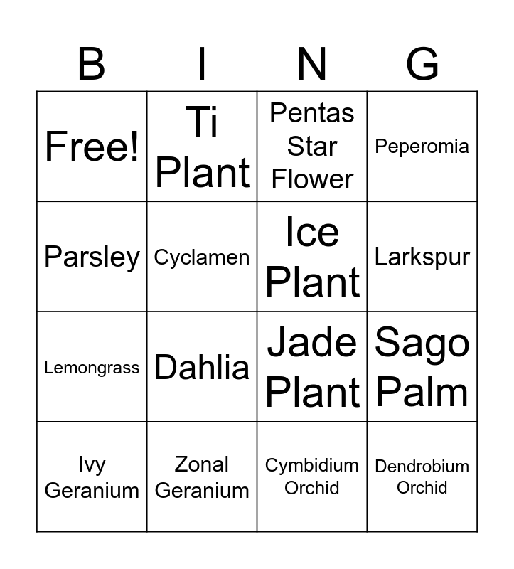 This bingo card has 16 words: Ivy Geranium, Zonal Geranium, Pentas Star Flower, Peperomia, Parsley, Ti Plant, Jade Plant, Sago Palm, Free!, Cyclamen, Cymbidium Orchid, Larkspur, Lemongrass, Dahlia, Ice Plant and Dendrobium Orchid.
