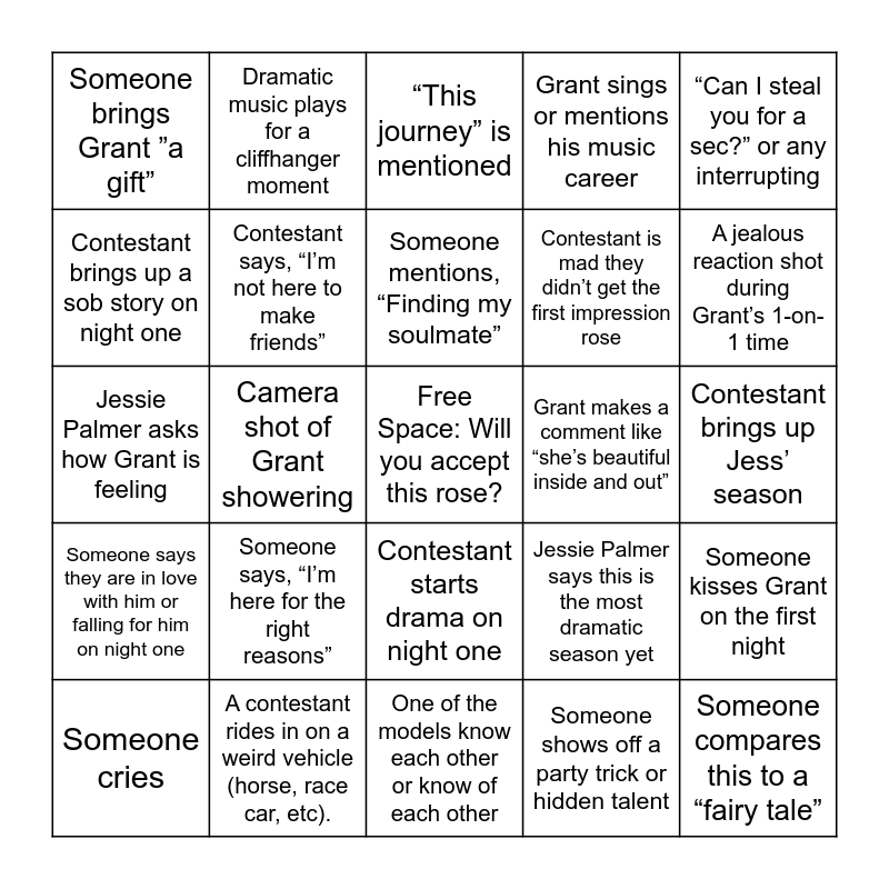 This bingo card has a free space and 24 words: Someone says, “I’m here for the right reasons”, A contestant rides in on a weird vehicle (horse, race car, etc)., Someone mentions, “Finding my soulmate”, Someone cries, “Can I steal you for a sec?” or any interrupting, Someone brings Grant ”a gift”, Contestant brings up a sob story on night one, Dramatic music plays for a cliffhanger moment, Grant makes a comment like “she’s beautiful inside and out”, Contestant starts drama on night one, Contestant is mad they didn’t get the first impression rose, Jessie Palmer asks how Grant is feeling, Jessie Palmer says this is the most dramatic season yet, Someone kisses Grant on the first night, Contestant says, “I’m not here to make friends”, Someone shows off a party trick or hidden talent, Contestant brings up Jess’ season, “This journey” is mentioned, A jealous reaction shot during Grant’s 1-on-1 time, Camera shot of Grant showering, Someone compares this to a “fairy tale”, Someone says they are in love with him or falling for him on night one, Grant sings or mentions his music career and One of the models know each other or know of each other.