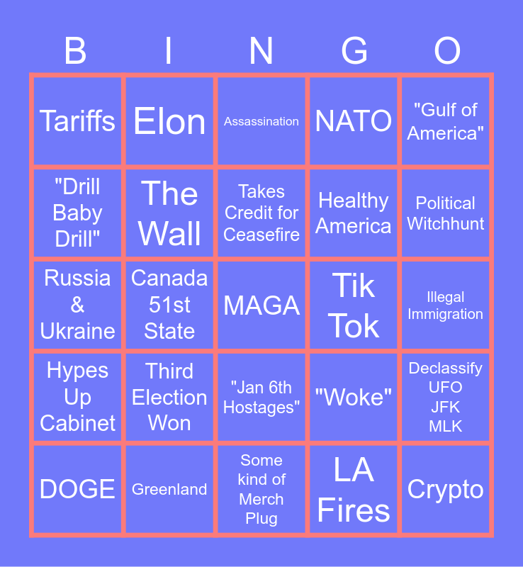 This bingo card has a free space and 24 words: Third Election Won, Greenland, Takes Credit for Ceasefire, DOGE, "Gulf of America", Tariffs, "Drill Baby Drill", Elon, Tik Tok, "Jan 6th Hostages", Healthy America, Russia & Ukraine, "Woke", Declassify UFO JFK MLK, The Wall, LA Fires, Illegal Immigration, Assassination, Political Witchhunt, Canada 51st State, Crypto, Hypes Up Cabinet, NATO and Some kind of Merch Plug.