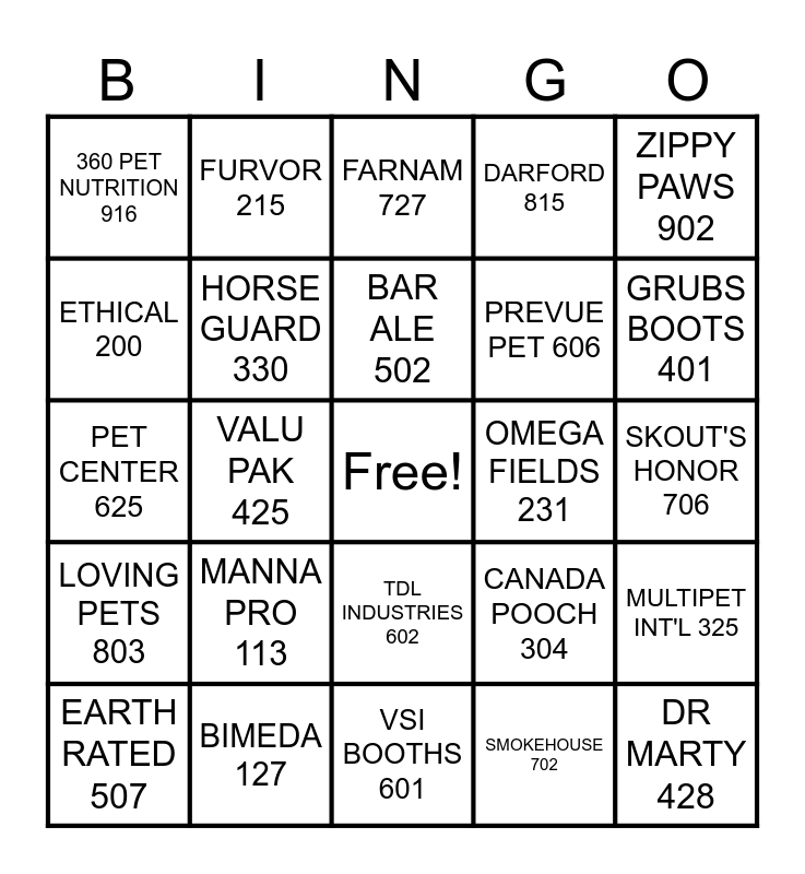 This bingo card has a free space and 24 words: MANNA PRO 113, BIMEDA 127, BAR ALE 502, EARTH RATED 507, ZIPPY PAWS 902, 360 PET NUTRITION 916, ETHICAL 200, FURVOR 215, OMEGA FIELDS 231, TDL INDUSTRIES 602, PREVUE PET 606, PET CENTER 625, CANADA POOCH 304, MULTIPET INT'L 325, HORSE GUARD 330, SMOKEHOUSE 702, SKOUT'S HONOR 706, FARNAM 727, GRUBS BOOTS 401, VALU PAK 425, DR MARTY 428, LOVING PETS 803, DARFORD 815 and VSI BOOTHS 601.