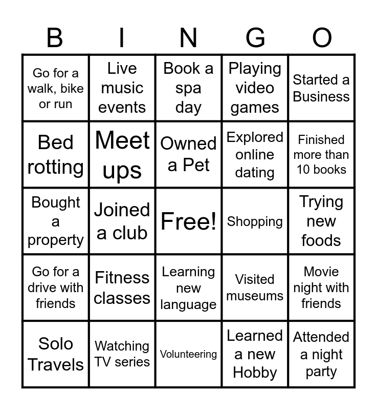 This bingo card has a free space and 24 words: Solo Travels, Fitness classes, Owned a Pet, Learned a new Hobby, Started a Business, Go for a walk, bike or run, Live music events, Book a spa day, Shopping, Trying new foods, Bought a property, Meet ups, Visited museums, Movie night with friends, Bed rotting, Watching TV series, Volunteering, Playing video games, Finished more than 10 books, Go for a drive with friends, Joined a club, Learning new language, Explored online dating and Attended a night party.