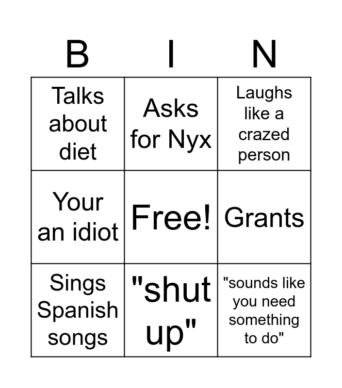 This bingo card has a free space and 11 words: Jackie talks about work, "shut up", "sounds like you need something to do", Sings Spanish songs, Asks for Nyx, Laughs like a crazed person, Grants, Sharon, Your an idiot, Talks about diet and Water.
