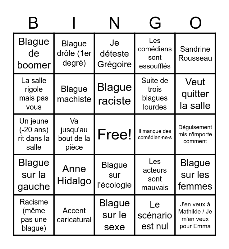 This bingo card has a free space and 24 words: Anne Hidalgo, Accent caricatural, Blague raciste, Racisme (même pas une blague), Sandrine Rousseau, Blague de boomer, La salle rigole mais pas vous, Blague drôle (1er degré), Il manque des comédien·ne·s, Blague sur l'écologie, Suite de trois blagues lourdes, Un jeune (-20 ans) rit dans la salle, Les acteurs sont mauvais, Blague sur les femmes, Blague machiste, Le scénario est nul, Déguisement mis n'importe comment, Je déteste Grégoire, Veut quitter la salle, Va jusqu'au bout de la pièce, J'en veux à Mathilde / Je m'en veux pour Emma, Blague sur la gauche, Les comédiens sont essoufflés and Blague sur le sexe.