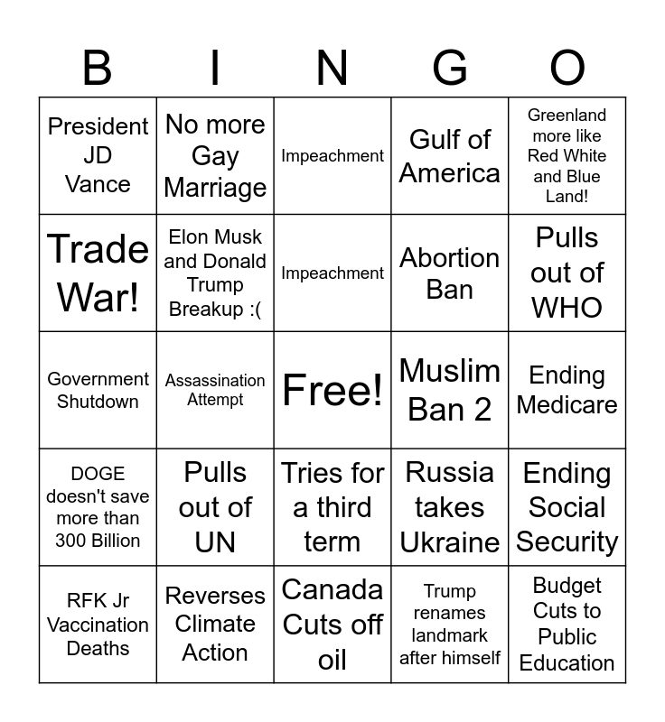 This bingo card has a free space and 24 words: Pulls out of UN, Reverses Climate Action, Impeachment, RFK Jr Vaccination Deaths, Greenland more like Red White and Blue Land!, President JD Vance, Trade War!, No more Gay Marriage, Muslim Ban 2, Tries for a third term, Abortion Ban, Government Shutdown, Russia takes Ukraine, Ending Social Security, Elon Musk and Donald Trump Breakup :(, Trump renames landmark after himself, Ending Medicare, Impeachment, Pulls out of WHO, Assassination Attempt, Budget Cuts to Public Education, DOGE doesn't save more than 300 Billion, Gulf of America and Canada Cuts off oil.