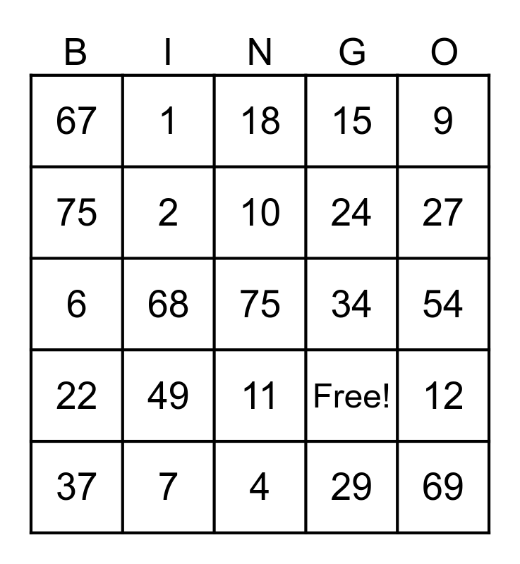 This bingo card has 25 words: 49, 4, 10, 37, 9, 67, 75, 1, 34, 11, 24, 6, Free!, 12, 2, 69, 54, 18, 27, 68, 75, 7, 22, 15 and 29.