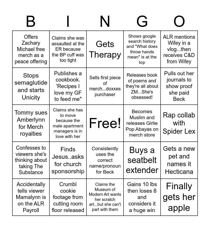 This bingo card has a free space and 24 words: Finds Jesus..asks for church sponsorship, Crumbl cookie footage from cutting room floor released, Sells first piece of merch...doxxes purchaser, Accidentally tells viewer Mamalynn is on the ALR Payroll, ALR mentions Wifey in a vlog...then receives C&D from Wifey, Offers Zachary Michael free merch as a peace offering, Stops semaglutide and starts Unicity, Claims she was assaulted at the ER because the BP cuff was too tight, Becomes Muslim and releases Girlie Pop Abayas on merch store, Consistently uses the correct name/pronoun for Beck, Releases book of poems and they're all about ZM...She's obsessed!, Tommy sues Amberlynn for Merch royalties, Buys a seatbelt extender, Gets a new pet and names it Hecticana, Publishes a cookbook. 'Recipes I love my GF to feed me", Gains 10 lbs then loses 8 and considers it a huge win, Rap collab with Spider Lex, Gets Therapy, Pulls out her journals to show proof she paid Beck, Claims she has to move because the male apartment managers is in love with her, Finally gets her apple, Confesses to viewers she's thinking about taking The Substance, Shows google search history and "What does throw hands mean" is at the top and Claims the Museum of Modern Art wants her scratch art...but she can't part with them.
