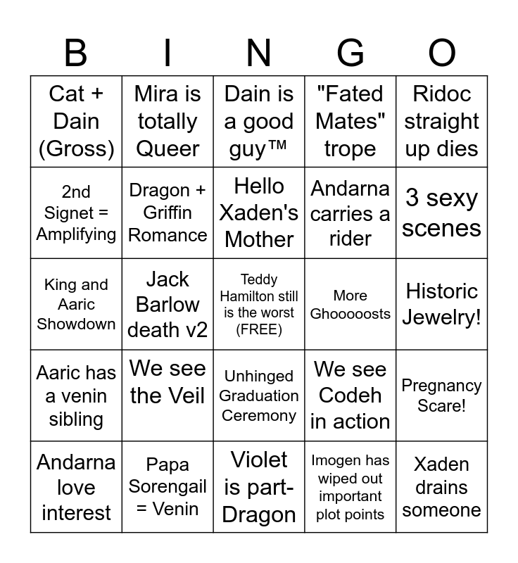 This bingo card has a free space and 24 words: We see the Veil, Papa Sorengail = Venin, Hello Xaden's Mother, Andarna love interest, Ridoc straight up dies, Cat + Dain (Gross), 2nd Signet = Amplifying, Mira is totally Queer, More Ghooooosts, Unhinged Graduation Ceremony, Andarna carries a rider, King and Aaric Showdown, We see Codeh in action, Pregnancy Scare!, Dragon + Griffin Romance, Imogen has wiped out important plot points, Historic Jewelry!, Dain is a good guy™, 3 sexy scenes, Jack Barlow death v2, Xaden drains someone, Aaric has a venin sibling, "Fated Mates" trope and Violet is part-Dragon.