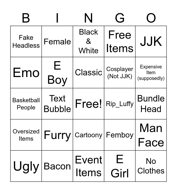 This bingo card has a free space and 24 words: Furry, Bacon, Classic, Ugly, JJK, Fake Headless, Emo, Female, Rip_Luffy, Cartoony, Cosplayer (Not JJK), Basketball People, Femboy, Man Face, E Boy, E Girl, Bundle Head, Black & White, Expensive Item (supposedly), Text Bubble, No Clothes, Oversized Items, Free Items and Event Items.