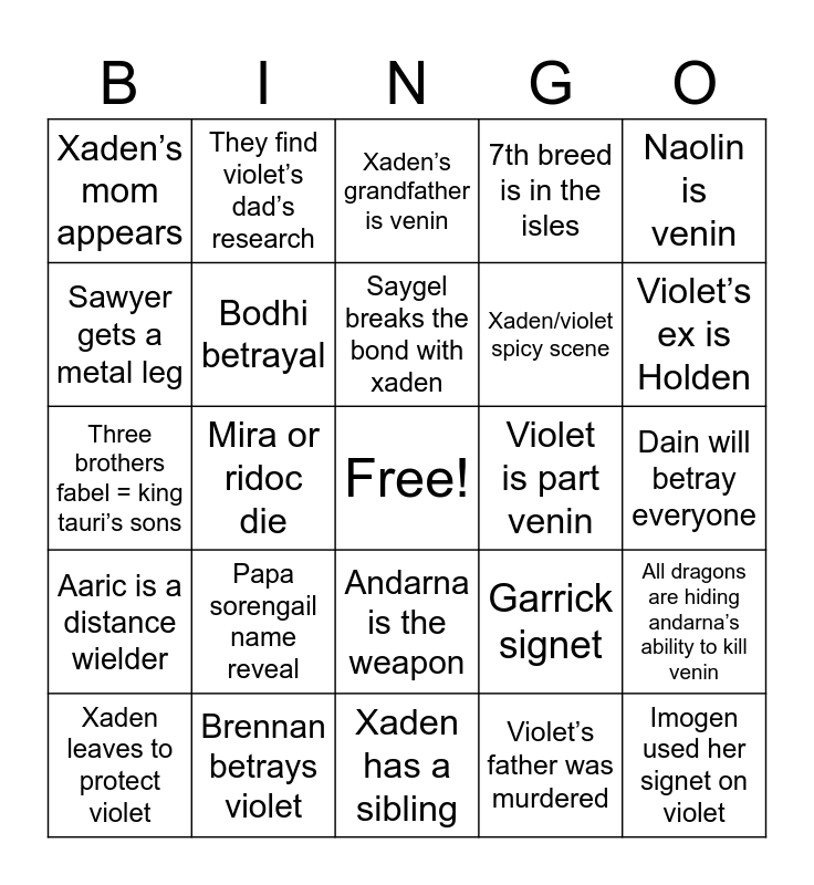 This bingo card has a free space and 24 words: Papa sorengail name reveal, Brennan betrays violet, Saygel breaks the bond with xaden, Xaden leaves to protect violet, Naolin is venin, Xaden’s mom appears, Sawyer gets a metal leg, They find violet’s dad’s research, Violet is part venin, Andarna is the weapon, Xaden/violet spicy scene, Three brothers fabel = king tauri’s sons, Garrick signet, All dragons are hiding andarna’s ability to kill venin, Bodhi betrayal, Violet’s father was murdered, Dain will betray everyone, Xaden’s grandfather is venin, Violet’s ex is Holden, Mira or ridoc die, Imogen used her signet on violet, Aaric is a distance wielder, 7th breed is in the isles and Xaden has a sibling.