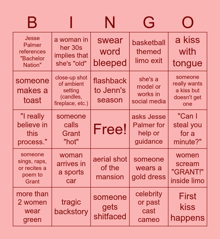 This bingo card has a free space and 44 words: Grant looks out over the horizon, First kiss happens, someone calls the show a "journey", more than 2 women wear green, someone cries in the mansion, celebrity or past cast cameo, swear word bleeped, "I really think my wife is in this room.", a kiss with tongue, tragic backstory, basketball themed limo exit, asks Jesse Palmer for help or guidance, aerial shot of the mansion, woman arrives in a sports car, an inappropriate joke introduction, someone gets shitfaced, woman with strong Southern accent, "I really believe in this process.", someone dances or asks Grant to dance, someone really wants a kiss but doesn't get one, a woman in her 30s implies that she's "old", woman has absurd job title, "This is the most ___ season ever.", Jesse Palmer references "Bachelor Nation", Grant talks about Jenn, "Can I steal you for a minute?", one of the women becomes a villain, Grant puts his hand on a woman's leg while talking, someone wears a gold dress, someone sings, raps, or recites a poem to Grant, someone brings sentimental item from home, women scream "GRANT!" inside limo, "I'm not here to make friends.", woman running/walking on beach in intro package, someone calls Grant "hot", someone calls Grant "handsome", two women say they're nervous, shot of Grant playing pick-up bball, flashback to Jenn's season, someone makes a toast, she's a model or works in social media, she's a nurse or doctor/works in medicine, close-up shot of ambient setting (candles, fireplace, etc.) and woman slips/trips/falls/is embarrassed getting out of limo.