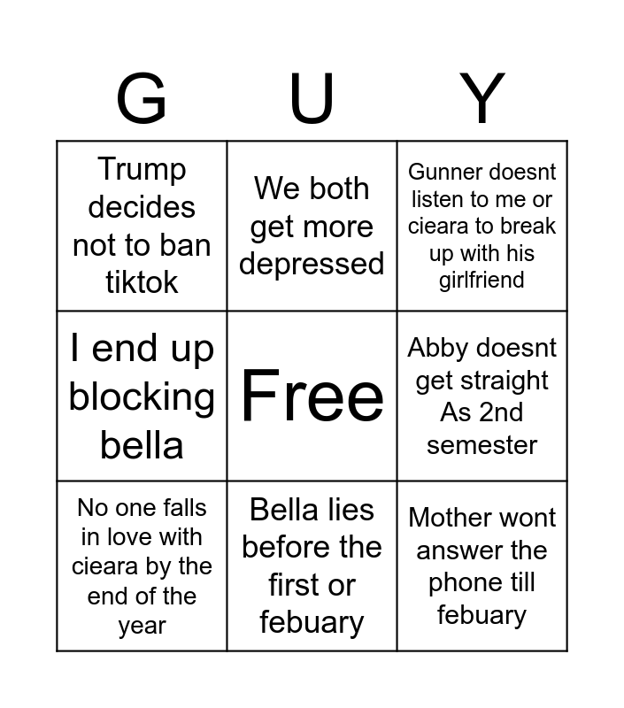 This bingo card has a free space and 8 words: Abby doesnt get straight As 2nd semester, Gunner doesnt listen to me or cieara to break up with his girlfriend, We both get more depressed, No one falls in love with cieara by the end of the year, Trump decides not to ban tiktok, Mother wont answer the phone till febuary, I end up blocking bella and Bella lies before the first or febuary.