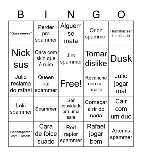 This bingo card has a free space and 24 words: Spammer, Cara de foice suado, Jiro spammer, Ganhar/perder com 3 stocks, Humilhar/ser humilhado, "Queeeeeeee", Nick sus, Perder pra spammer, Revanche nao ser aceita, Ser convidado pra uma sala, Tomar dislike, Julio reclama do rafael, Começar a rir do nada, Cair com um duo, Cara com skin que é ruim, Rafael jogar bem, Julio jogar mal, Alguem se mata, Dusk, Queen nai spammer, Artemis spammer, Loki spammer, Orion spammer and Red raptor spammer.