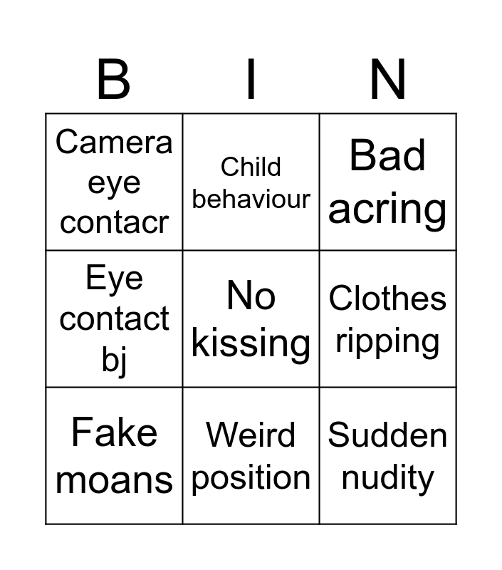 This bingo card has 9 words: Fake moans, Bad acring, Child behaviour, Eye contact bj, Camera eye contacr, Clothes ripping, No kissing, Sudden nudity and Weird position.