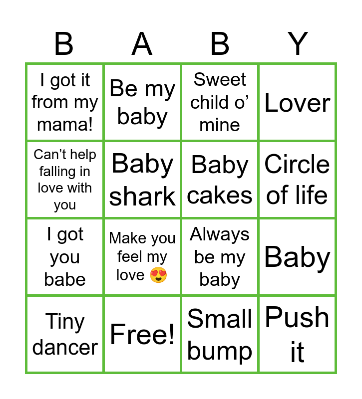 This bingo card has 30 words: Juno, L-O-V-E, Baby, Baby one more time, I got it from my mama!, Sweet child oβ mine, Baby cakes, Baby got back π, Free!, Rockabye Baby, Small bump, Tiny dancer, Can you feel the love tonight, Mama, Make you feel my love π, Canβt take my eyes off you, Letβs get it on, Push it, Wind the bobbin up, Canβt help falling in love with you, Always be my baby, You are my sunshine, Be my baby, I got you babe, Baby shark, Lover, Having my baby, Mockingbird, Circle of life and We are family.