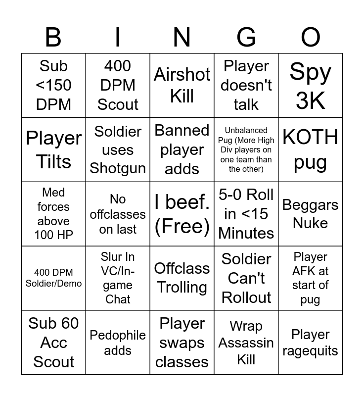 This bingo card has a free space and 24 words: Slur In VC/In-game Chat, Pedophile adds, Banned player adds, Sub 60 Acc Scout, Spy 3K, Sub <150 DPM, Player Tilts, 400 DPM Scout, 5-0 Roll in <15 Minutes, Offclass Trolling, Unbalanced Pug (More High Div players on one team than the other), Med forces above 100 HP, Soldier Can't Rollout, Player AFK at start of pug, Soldier uses Shotgun, Wrap Assassin Kill, Beggars Nuke, Airshot Kill, KOTH pug, No offclasses on last, Player ragequits, 400 DPM Soldier/Demo, Player doesn't talk and Player swaps classes.
